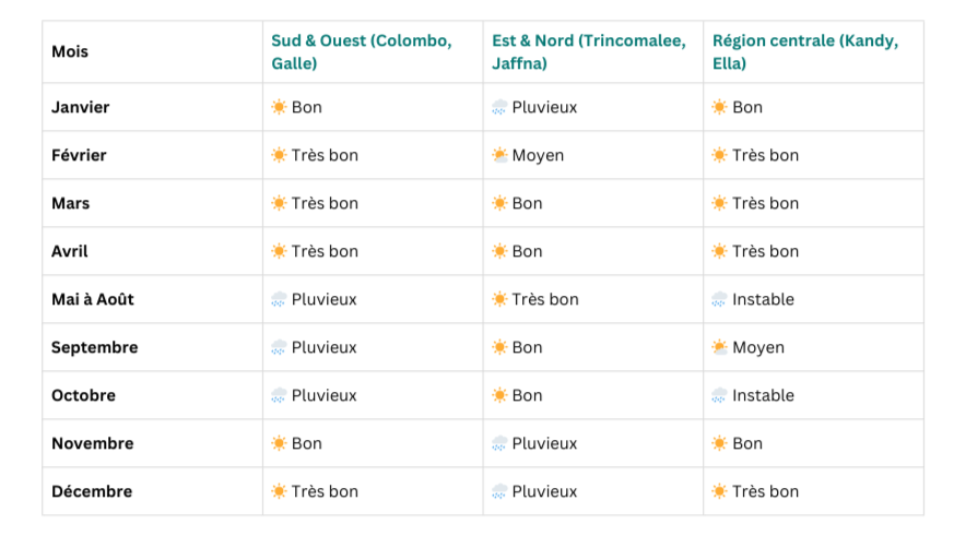 Un tableau résumant la météo par région et par mois au Sri Lanka